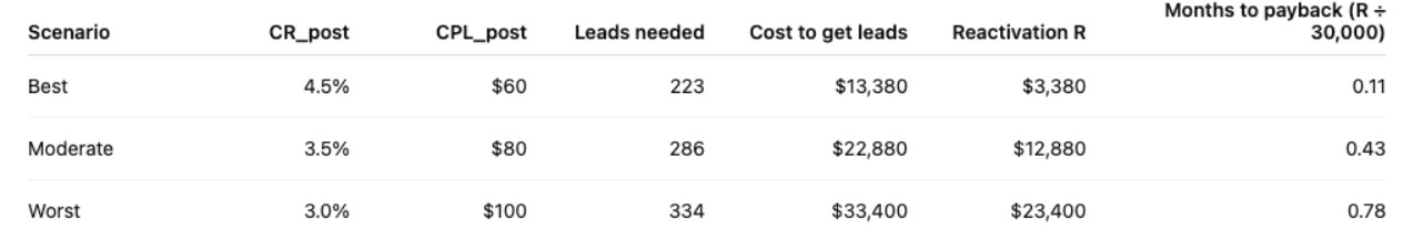 All three scenarios show a large negative NPV for a three-month pause. The dealer forfeits approximately $120,000 in gross profit over three months while saving only $30,000 in ad spend. Adding the reactivation spend produces a material loss in present value. The reactivation spend is significant and grows as CR_post falls and CPL_post rises.