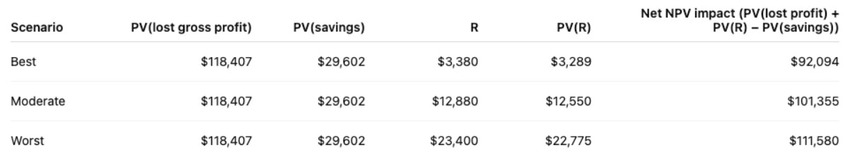 A simple comparison: if R plus PV(lost profit) minus PV(savings) is greater than zero, then the pause is a net economic loss and should not be approved without an alternative plan that preserves momentum.